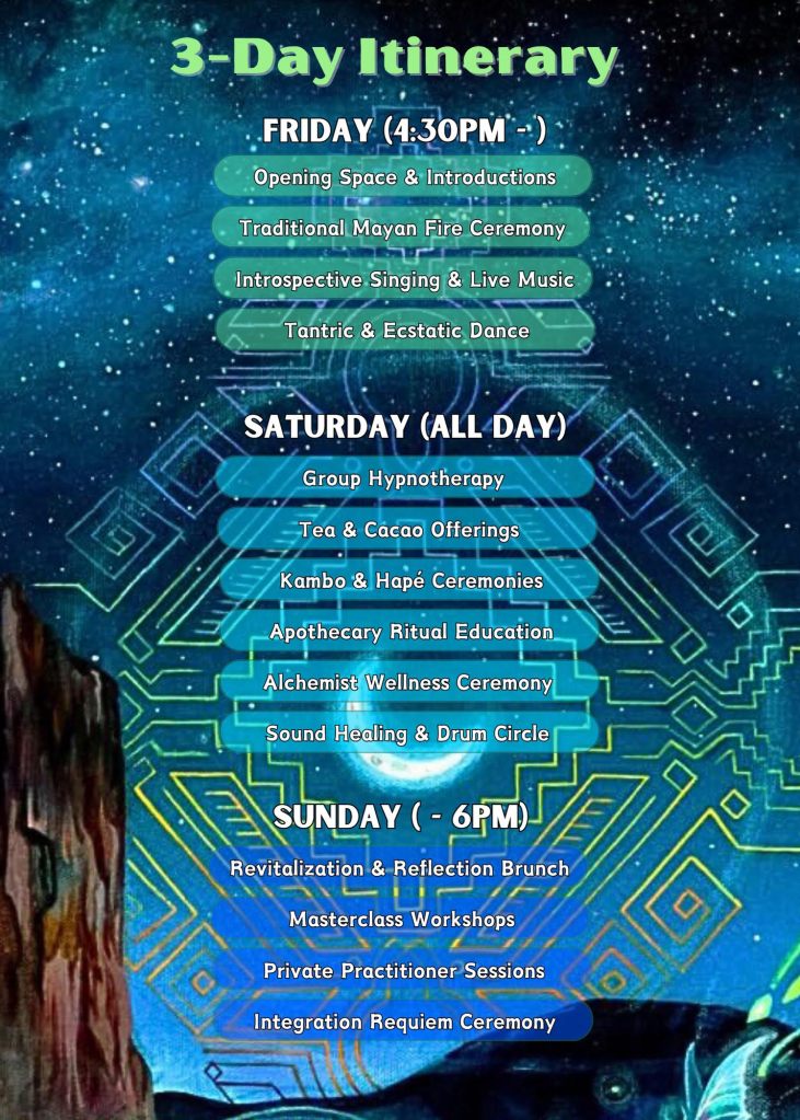 You will have the chance to meet and learn from many practitioners, who will guide you through various activities such as plant medicine journeys, traditional Mayan fire ceremony, sound healing and drum circles, apothecary rituals, masterclass workshops, and more! You will also enjoy delicious vegan food, including stunning mountain views of the natural surroundings.